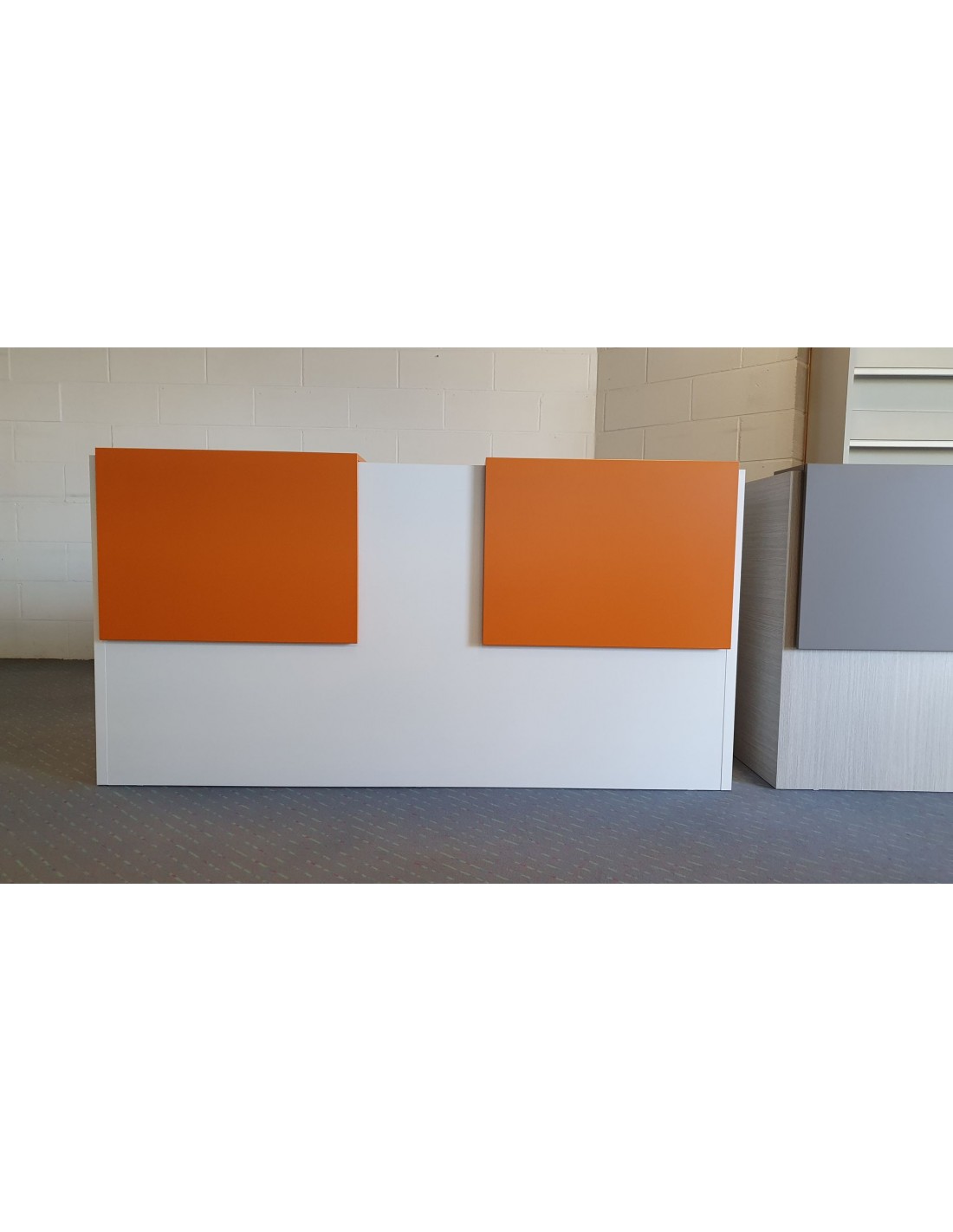 Comptoir de réception en bois melaminé avec rehausse. Deux caissons mobiles avec trois tiroirs de rangement inclus.